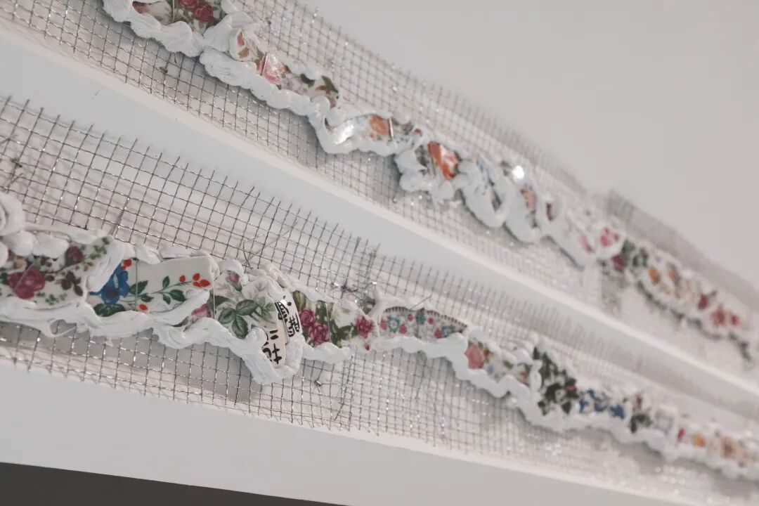 作品说明:2017年7月我们使用城镇拆迁遗留的私人物件营造出一座可移动的“公园”。这四年“公园”游转过四座城市(北京、南京、重庆、杭州)。在反复呈现过程中,私人——公共——再到私人,我们发现公共与私人之间存在某种变换规律,它们含混不清,甚至能够互相转变。而今来到深圳,我们决定对“公园计划”继续“拆迁”——去装修一个客厅。客厅是私人社交之处,公共区域到私人区域的过渡和缓冲地带。客厅的鲜明特征为吊顶,使用“公园计划”的瓷盘,制作一件所谓“简欧风格”的吊顶,安装在美术馆的天花板。来吧,进入这个“客厅”。